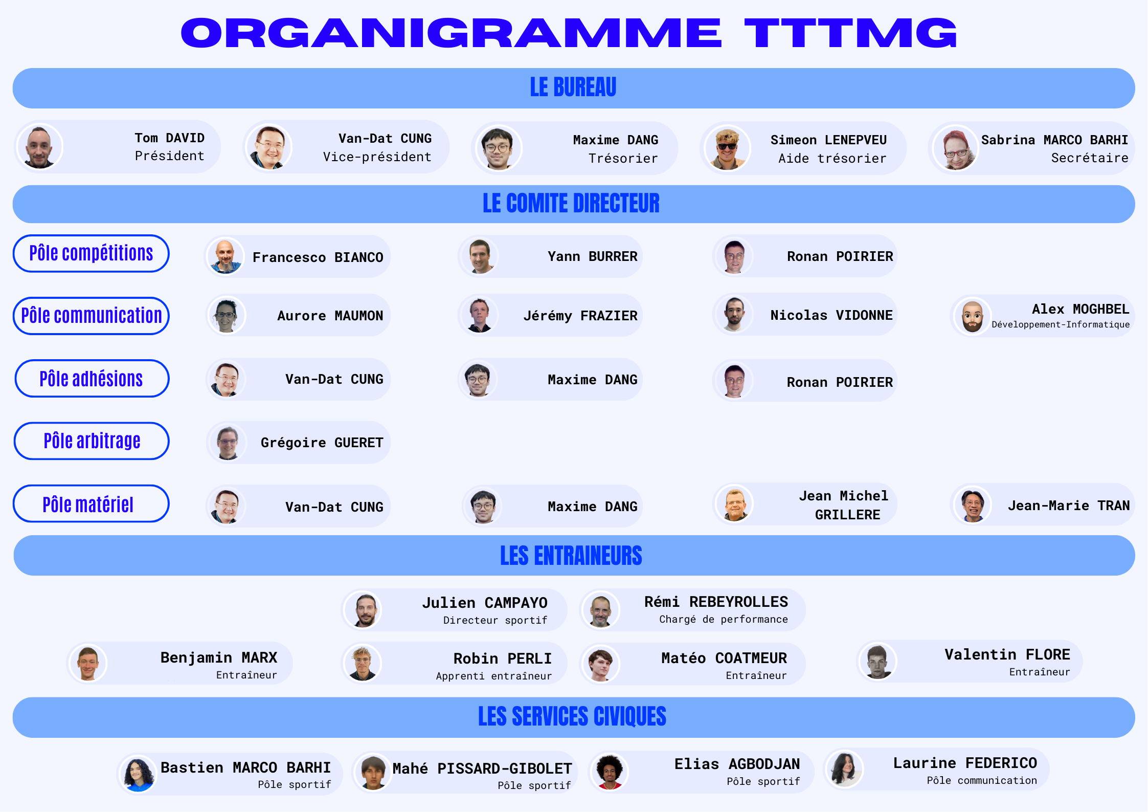 Le TTTMG, Tennis de Table La Tronche Meylan Grenoble, est une association sportive, affiliée à la Fédération Française Tennis de Table sous le numéro 01380056. Historiquement basé à La Tronche et aujourd’hui aussi à Grenoble et Meylan, il est naturellement membre de la Ligue Auvergne-Rhône-Alpes et du Comité de l’Isère.