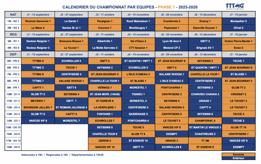 Le championnat par équipes se déroule en 2 phases, de septembre à janvier puis de janvier à juin. Les rencontres se jouent le samedi après-midi, par équipe de 4 joueurs (3 en D4), de tous âges à partir de benjamin.